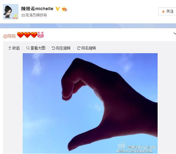 今日,陳曉終于發微博承認了與陳妍希的戀情,稱:總有一天,你會跟我姓。用一張手比心照片作為配圖并艾特了陳妍希,隨后陳妍希也發微博艾特了陳曉同樣配圖用手比另一半心,兩個半心拼起來正好是一個完整的心。