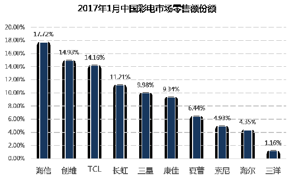 根據中怡康最新發布的2017年1月份月報統計數據,海信電視零售量、零售額占有率分別達到16.7%和17.7%,雙雙高居中國彩電市場銷售量和銷售額占有率的第一位,其中銷售額占有率超出第二名2.79個百分點.