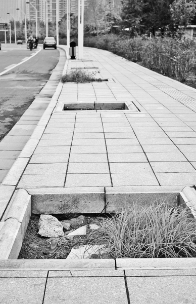昨日,記者來到鄭東新區商務外環路,在商務外環路與商務西三街交叉口發現,商務外環路人行道上有一排整齊的樹坑,大略一數,共計45個樹坑。這些樹坑呈正方形,長寬約有1米,每個樹坑相距約3米。樹坑大多長滿野草,有的樹坑內堆滿生活垃圾。這一場景與郁郁蔥蔥的周邊環境很不協調。