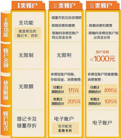 簡單說,Ⅰ類賬戶是全功能賬戶,常見的借記卡就屬于Ⅰ類賬戶;Ⅱ、Ⅲ類賬戶則是虛擬的電子賬戶,是在已有Ⅰ類賬戶基礎(chǔ)上增設(shè)的兩類功能逐級遞減,資金風(fēng)險也逐級遞減的賬戶。主要區(qū)別如下表: