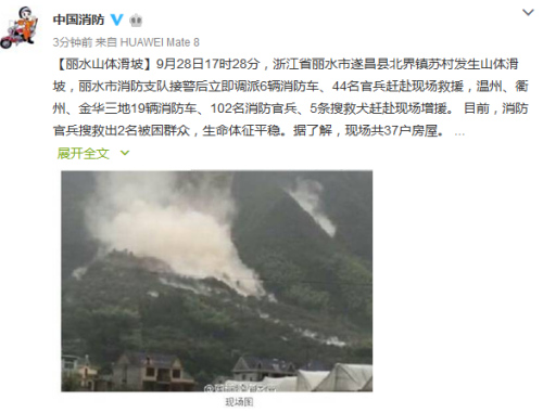 中新網9月28日電 據公安部消防局官方微博消息,9月28日17時28分,浙江省麗水市遂昌縣北界鎮蘇村發生山體滑坡,目前,消防官兵搜救出2名被困群眾,生命體征平穩。據了解,現場共37戶房屋。同時,村莊旁邊小溪形成堰塞湖,可能發生局部二次滑坡。